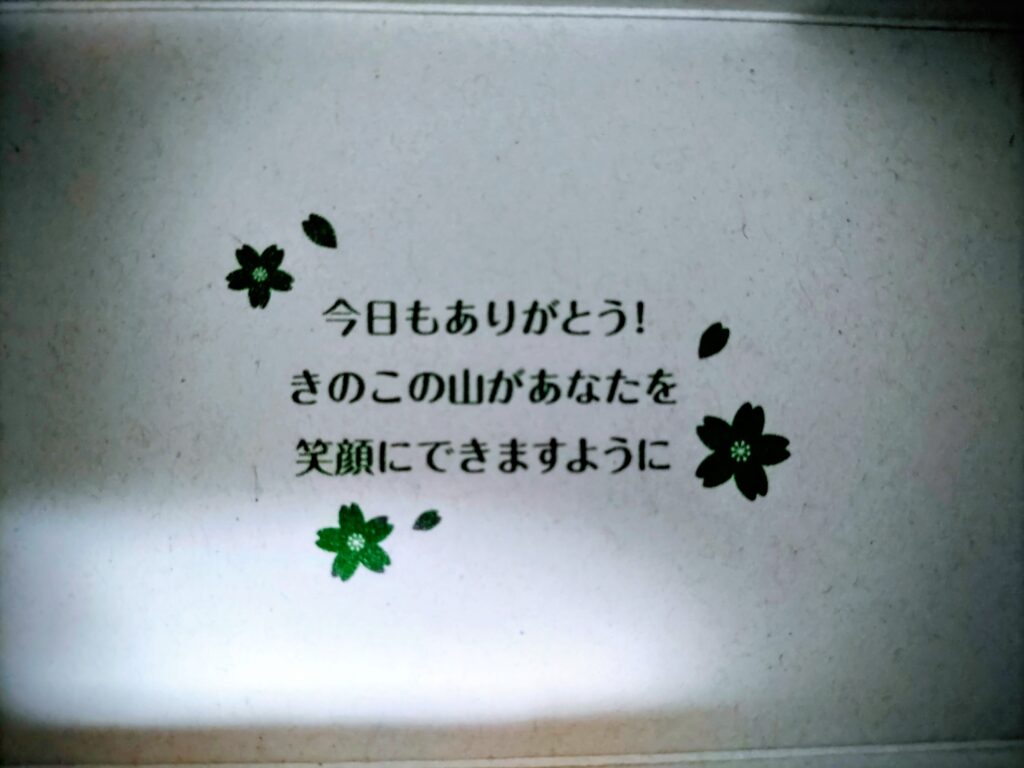 「きのこの山」は食べ終えると底に、嬉しいメッセージ発見!細やかな配慮に感謝します。