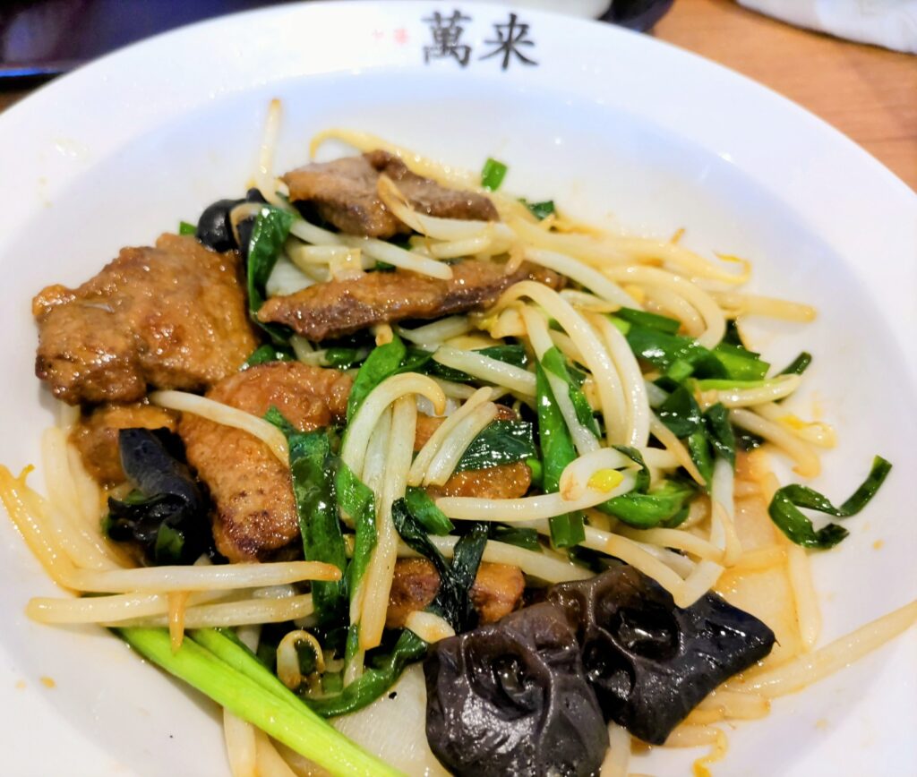 中華 萬来のレバニラ炒め、大盛りで頂きました、うまい!