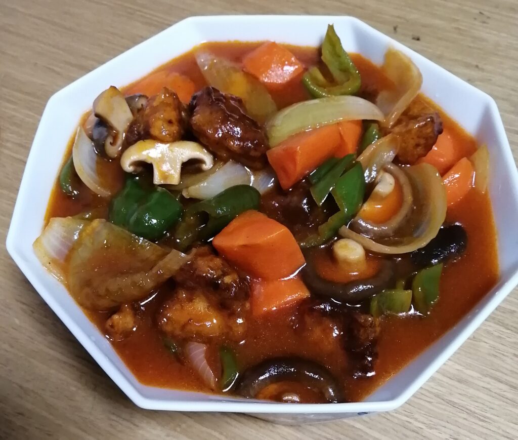 最後に揚げた豚肉をあんかけに絡めて出来上がりです。